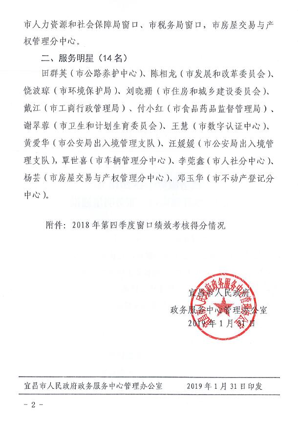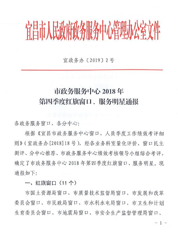 市政务服务中心2018年第四季度红旗窗口、服务明星通报