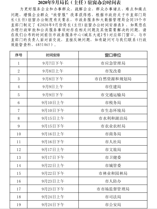 2020年9月局长(主任)驻窗办公时间表