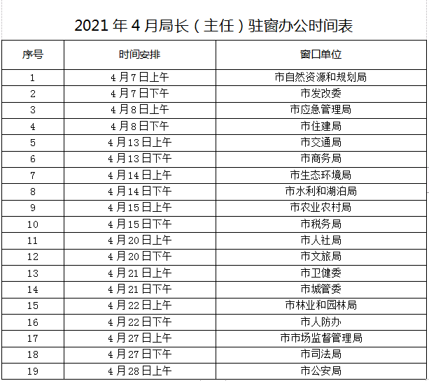 2021年4月局长(主任)驻窗办公时间表