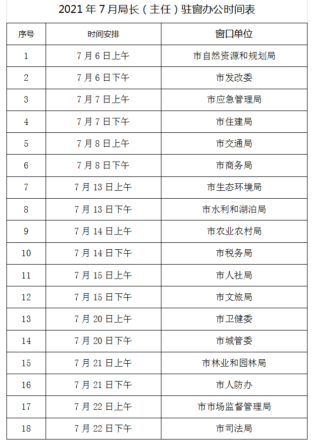 2021年7月局长(主任)驻窗办公时间表