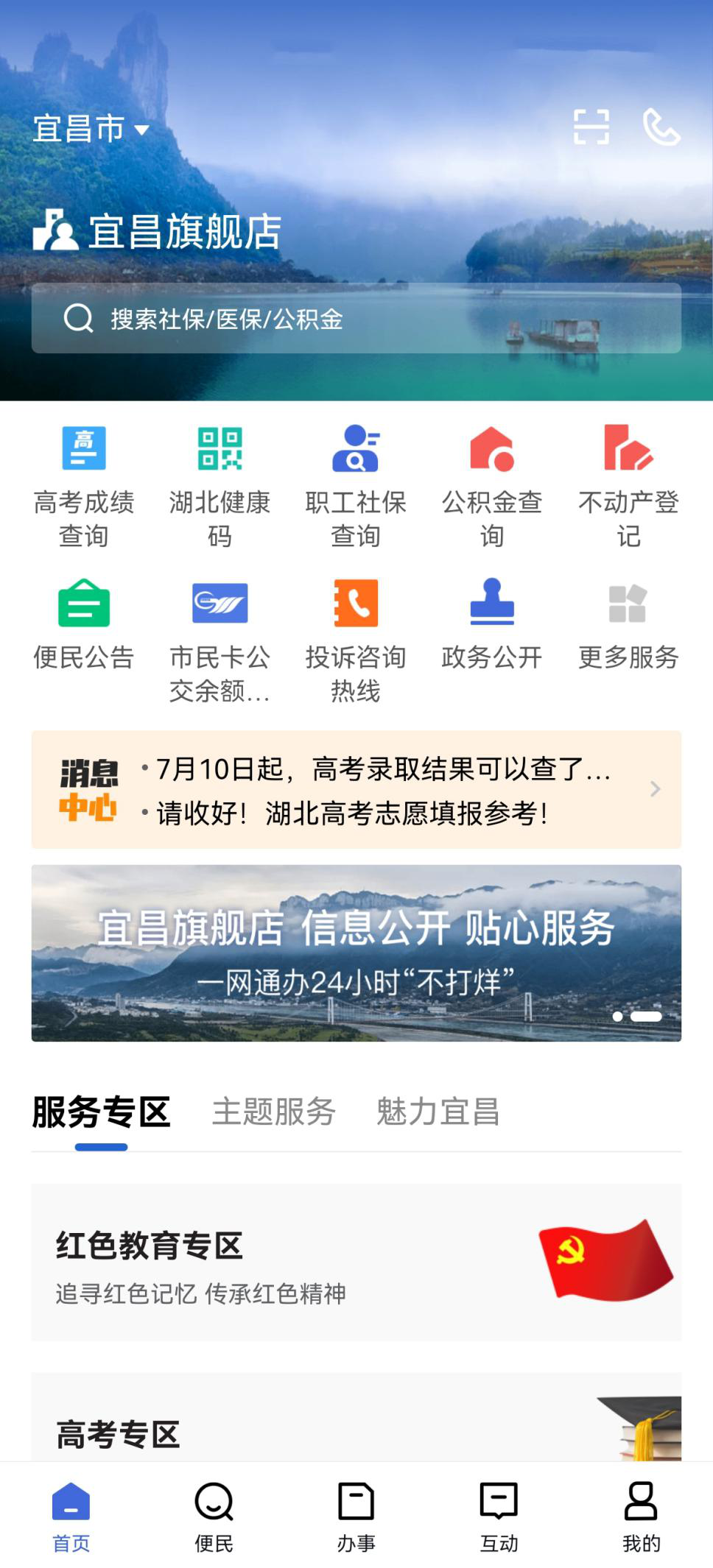 打开“鄂汇办”手机APP,左上角区域选择“宜昌市”,则可看到以清江画廊为背景的“宜昌旗舰店”,首页展示了职工社保查询、公积金查询、不动产登记等高频服务事项,点击“更多服务”可查看市民卡公交余额查询、学生报名信息查询、健康证申办等更多民生热点服务事项。