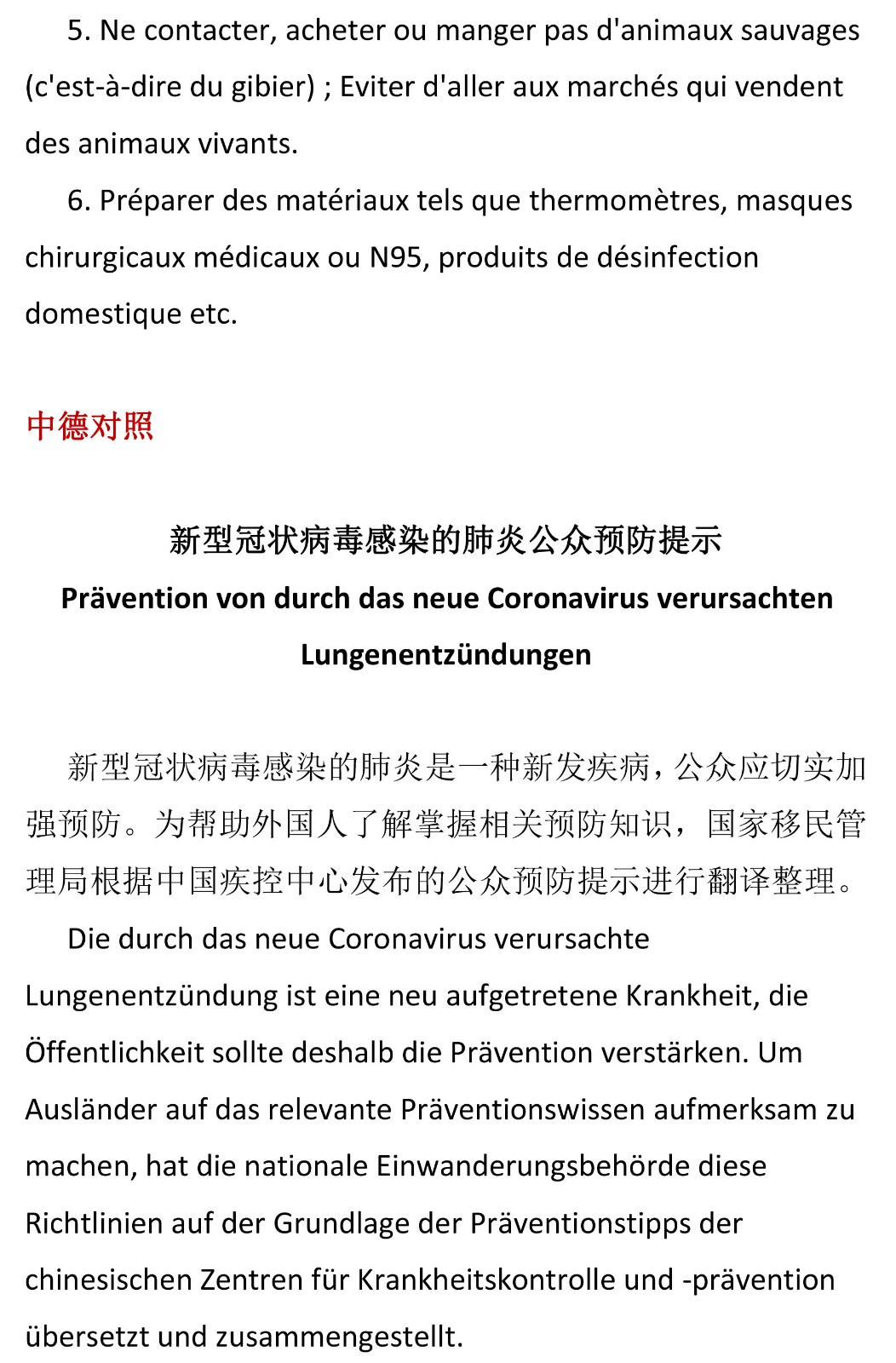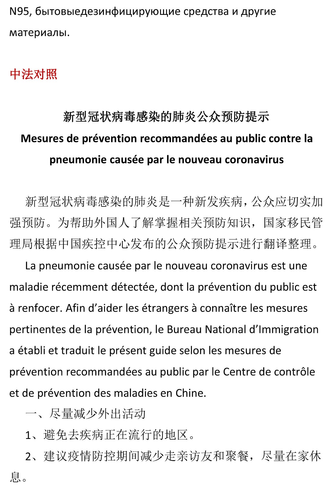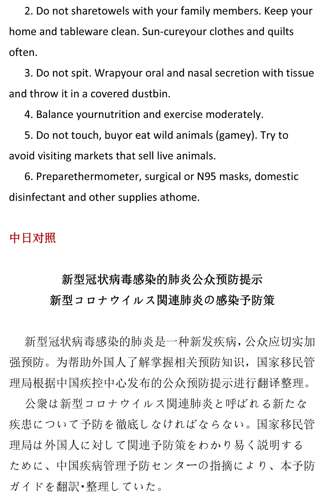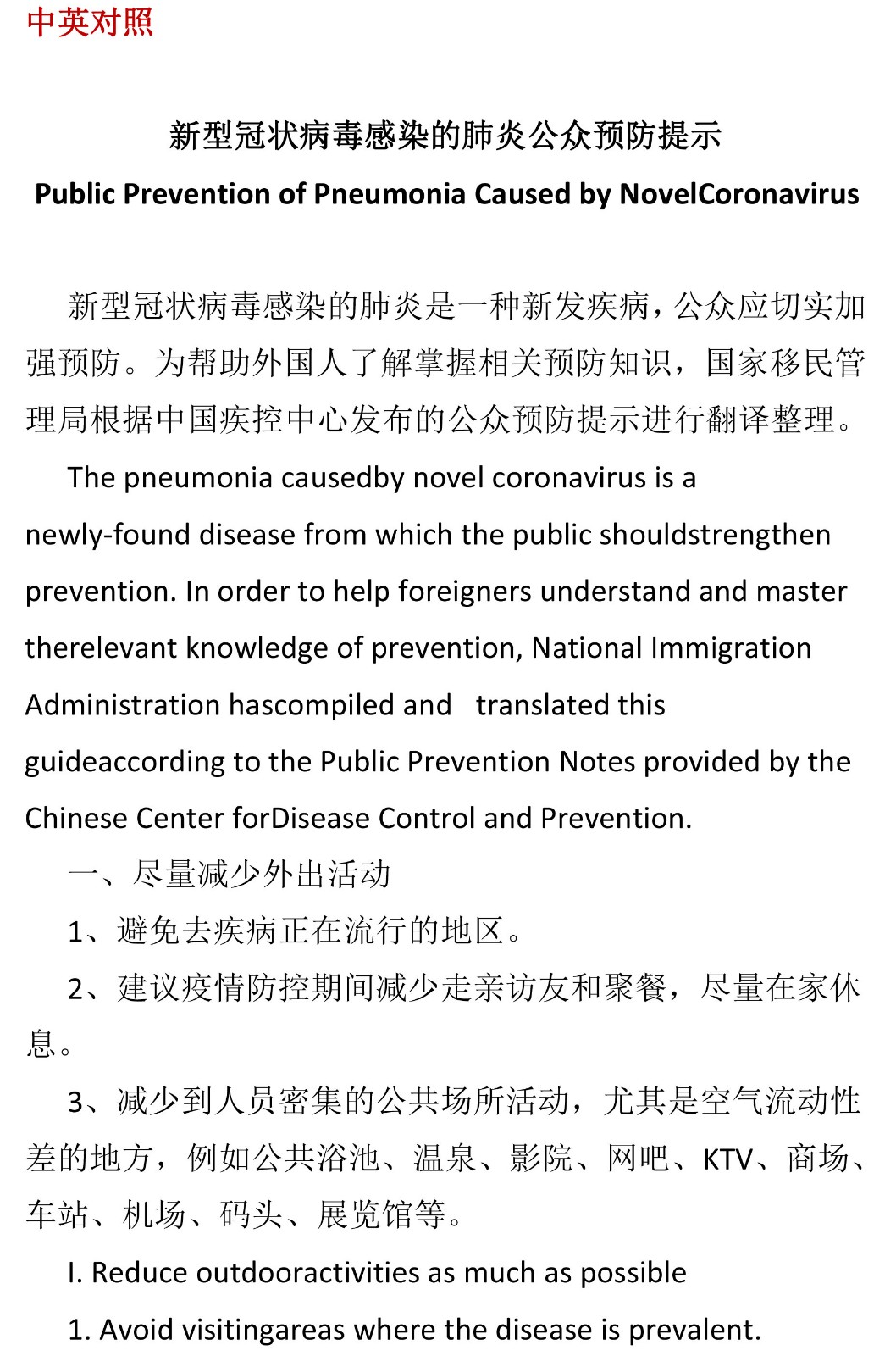 新型冠状病毒预防提示(中英、中日、中韩、中俄、中法、中德对照)