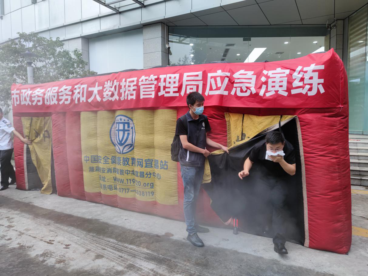 培训结束后,所有参训人员在停车场模拟烟雾逃生通道参加了烟雾逃生应急演练。(宜昌市政务服务和大数据管理局)