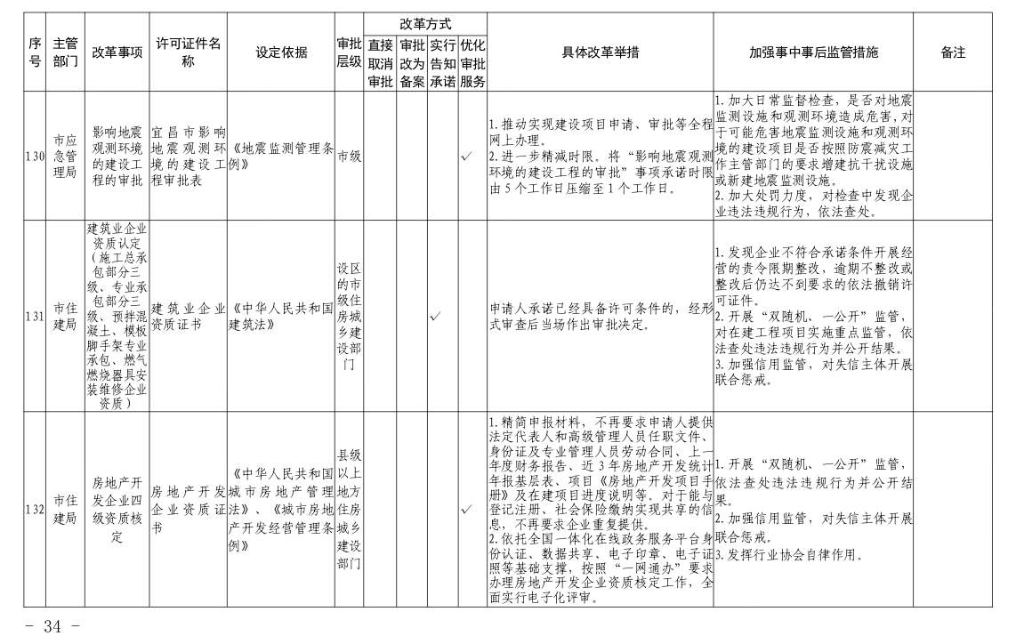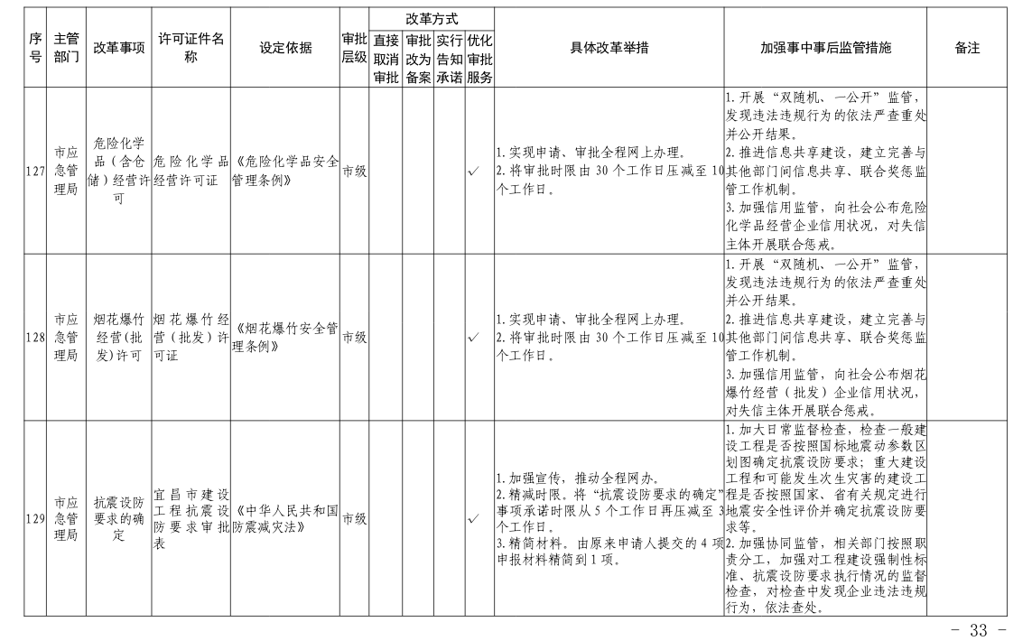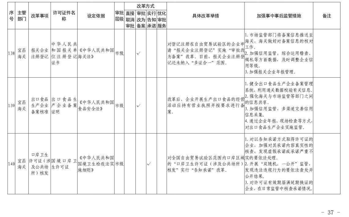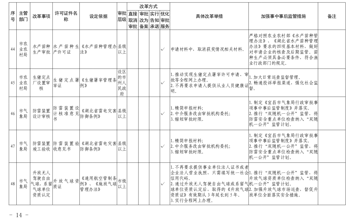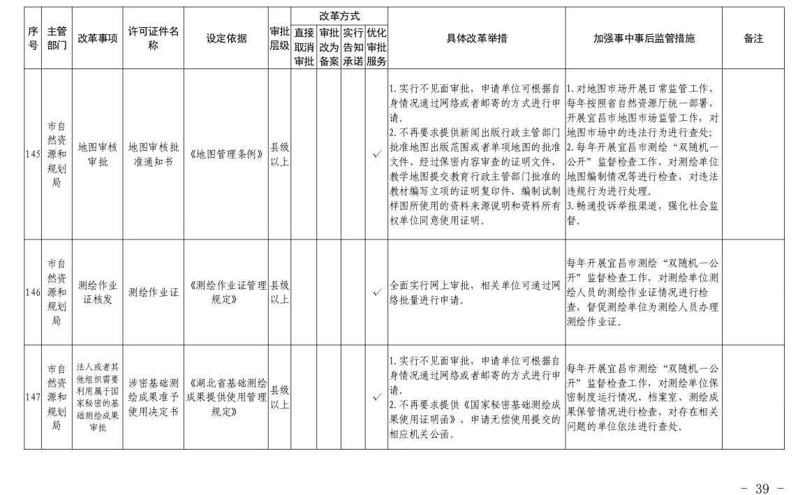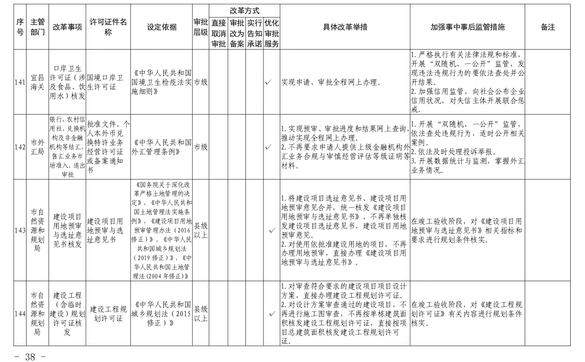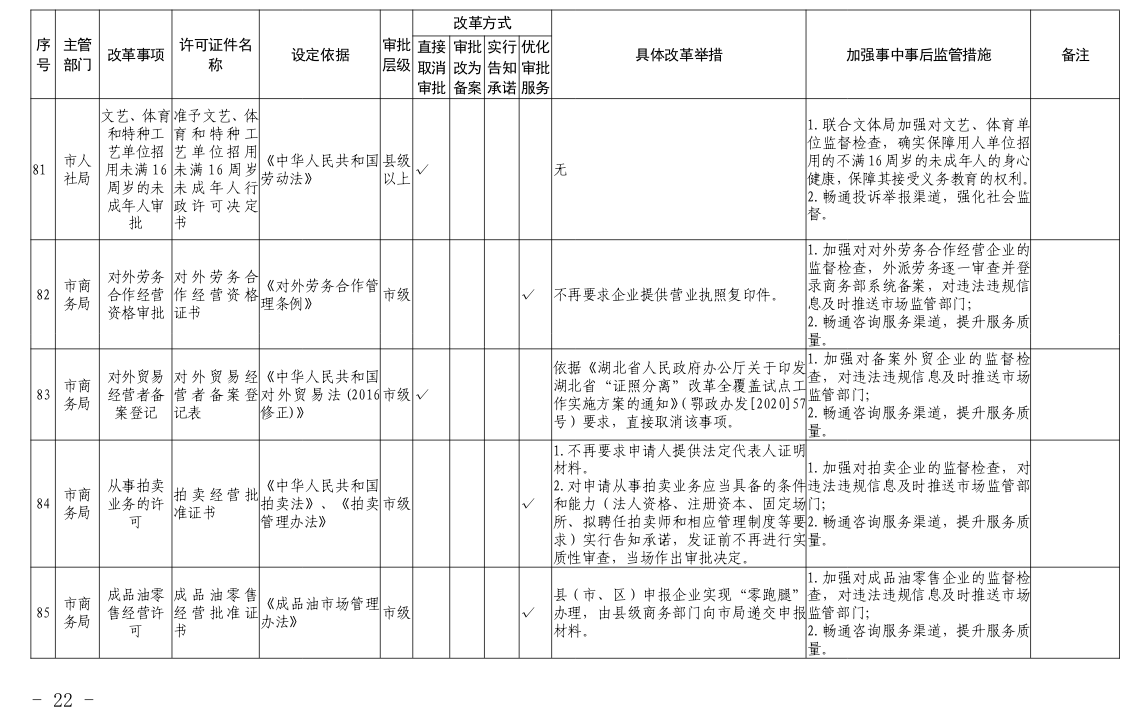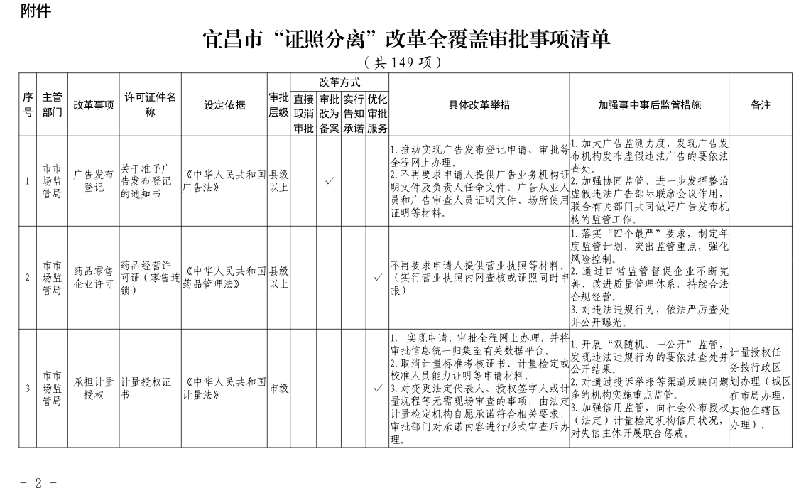 根据国务院和省政府关于“证照分离”改革任务部署和《市人民政府办公室关于印发宜昌市“证照分离”改革全覆盖工作实施方案的通知》(宜府办发〔2020〕37号)要求,经各部门申报、市市场监管局汇总审核、市司法局合法性审查,形成了宜昌市“证照分离”改革全覆盖审批事项清单,现将清单予以公布,请各部门对改革事项按照改革方式认真落实。